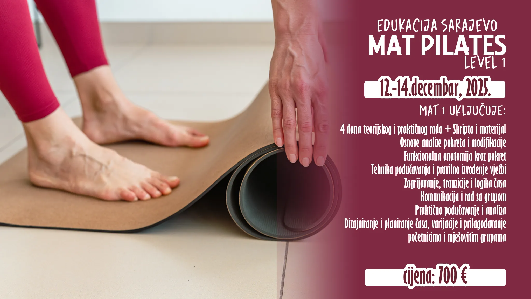 Mat Pilates predstavlja bazu znanja I osnovu za rad na svim ostalim Pilates spravama, te samim tim smatramo da je Mat Pilates prvi nivo sa kojim trebate započeti svoj put Pilates instruktora. Bilo da ste bili instruktor nekog od grupnih programa, lični trener ili ste u potrazi za promjenom vaše struke, ovo je početni nivo obuke od koje treba krenuti I koji će Vam pomoći da izgradite temeljno znanje o Pilates Metodi, bolje usvojite njegove osnovne principe I fokusirate se na formu pravilnog izvođenja vježbi. Dobijanjem osnovnih principa i postulate pilatesa uz tutorski rad, imaćete dovoljno vremena da se izgradite u dobrog i kvalitetnog instruktora pilatesa.