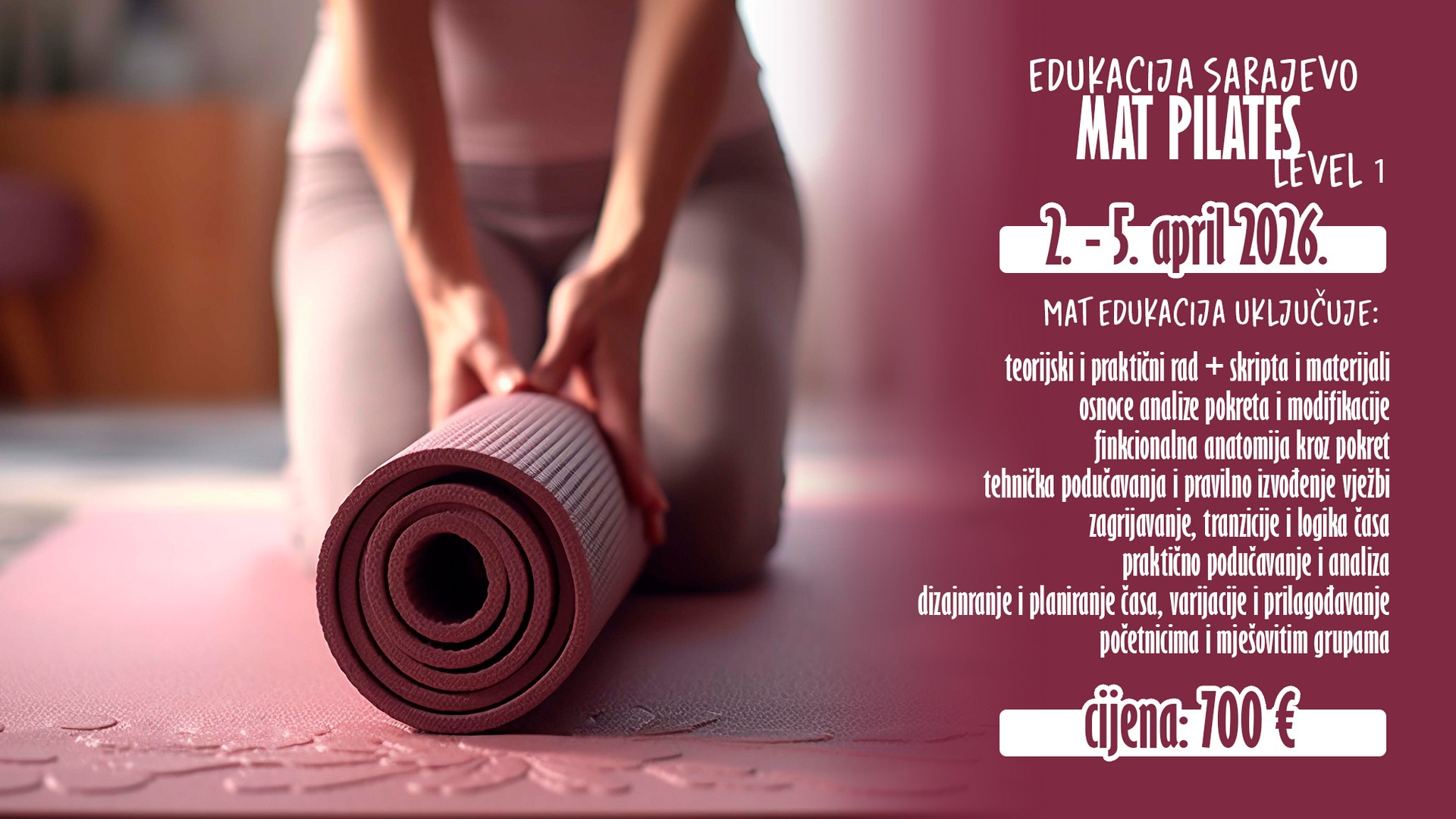 Mat Pilates predstavlja bazu znanja I osnovu za rad na svim ostalim Pilates spravama,  te samim tim smatramo da je Mat Pilates prvi nivo sa kojim trebate započeti svoj put Pilates instruktora. Bilo da ste bili instruktor nekog od grupnih programa, lični trener ili ste u potrazi za promjenom vaše struke, ovo je početni nivo obuke od koje treba krenuti I koji će Vam pomoći da izgradite temeljno znanje o Pilates Metodi, bolje usvojite njegove osnovne principe I fokusirate se na formu pravilnog izvođenja vježbi. Dobijanjem osnovnih principa i postulate pilatesa uz tutorski rad, imaćete dovoljno vremena da se izgradite u dobrog i kvalitetnog instruktora pilatesa.